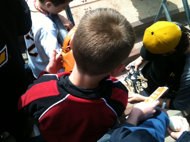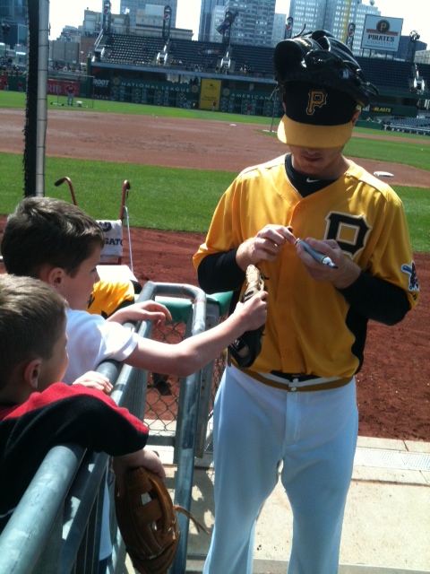 At noon they opened the gates to the empty park. The Reds were taking batting practice and pitchers were playing toss. We worked our way to the Pirates dugout where we started to grab the autographs of players going by. First was a guy no one knew, then Melancon, Wilson, and finally their closer Grilli, who was so damn nice. There was a crowd of over 100 at this point and the boys stayed put at the front rail. Jack had a McCutchen jersey on and wanted him to sign.
