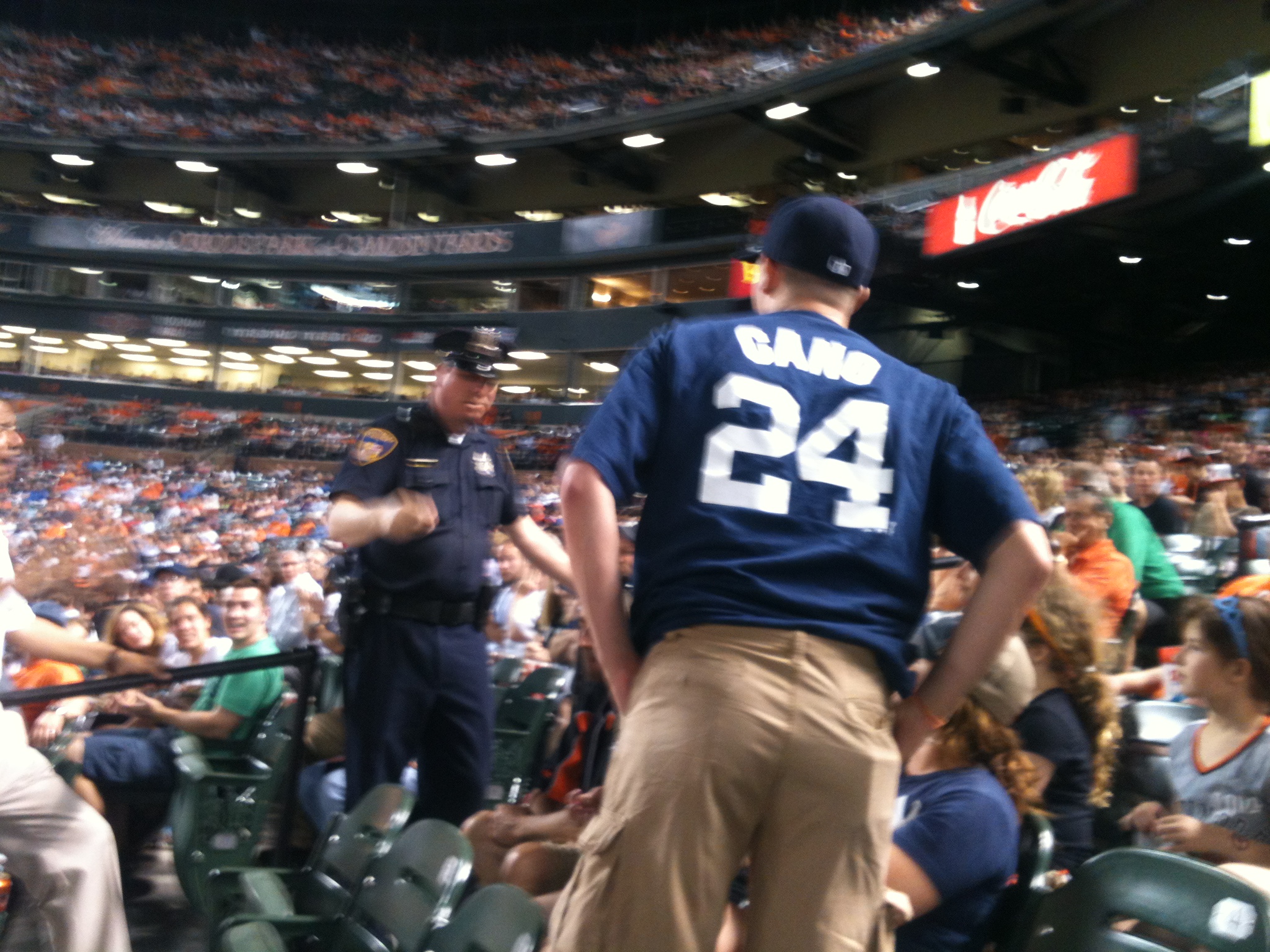 In the 9th inning the Yankees tied it up with a home run, so the score was 4-4. Pete and I were going wild. Also of note for the inning was that an idiot in a Yankees shirt next to us got into an argument with a father and his two little girls. The idiot was removed (thankfully). Pete and I turned to the crowd and apologized to everyone on behalf of Yankees fans.