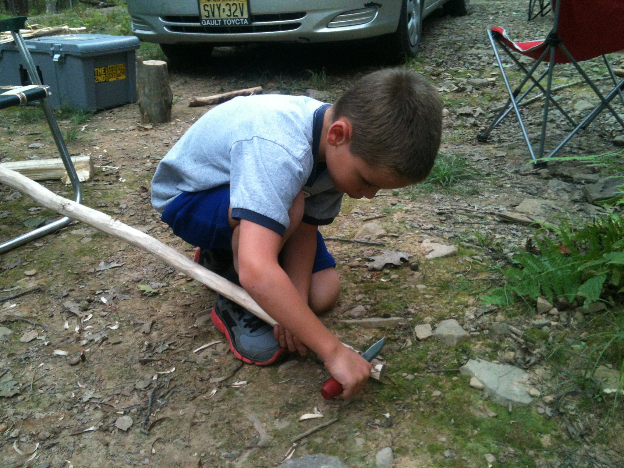 Alex practicing firestarting with some gadget of Hal’s. Note that the knife is right next to him. As soon as I gave Alex his knife, he took it everywhere, including the bathroom.