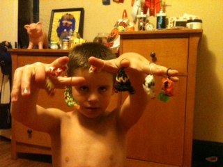 Alex put on headphones and watched instructional videos for the Rainbow Loom. He ran my phone, our iPad, and my work computer out of juice over the course of the game.