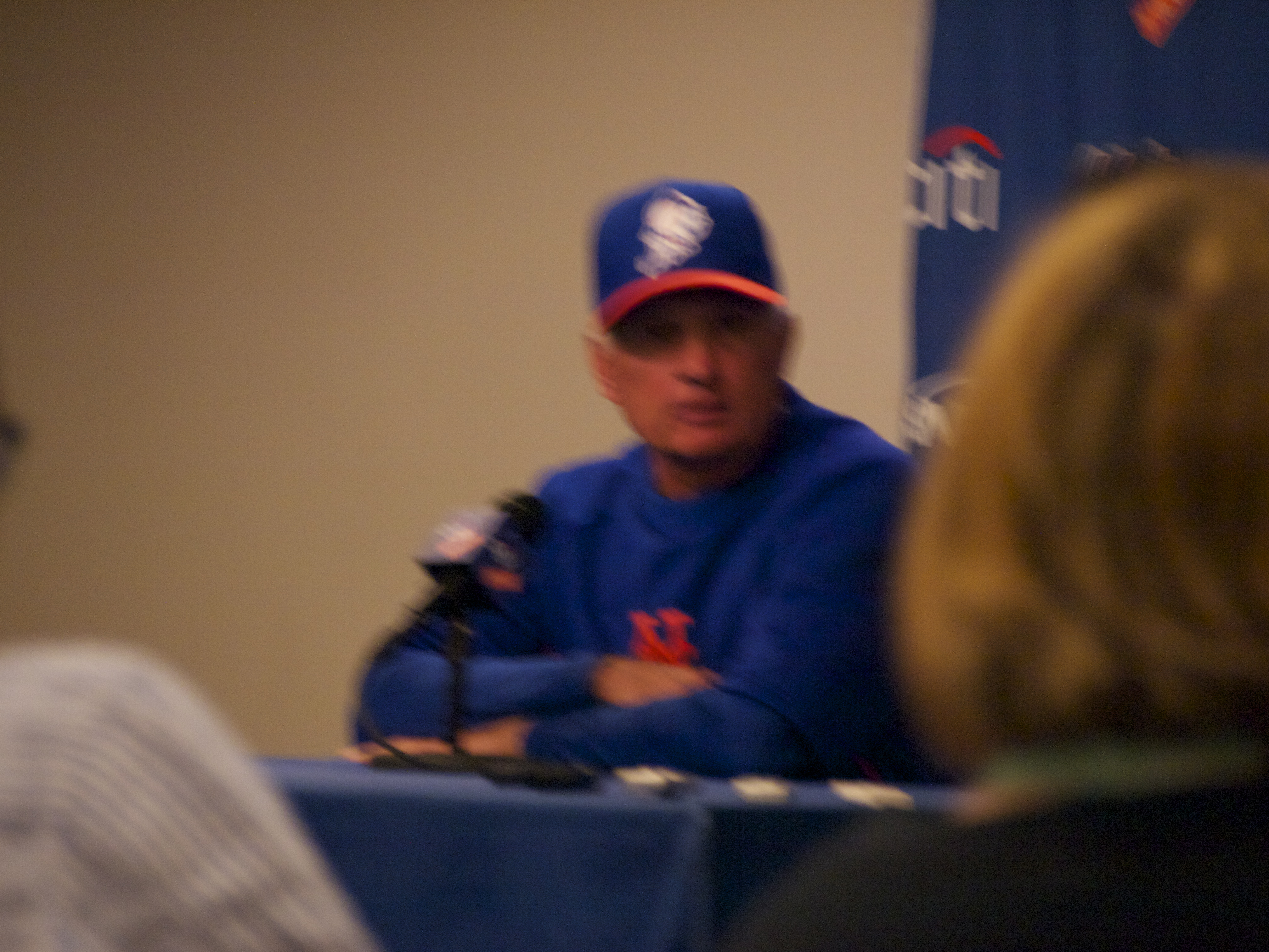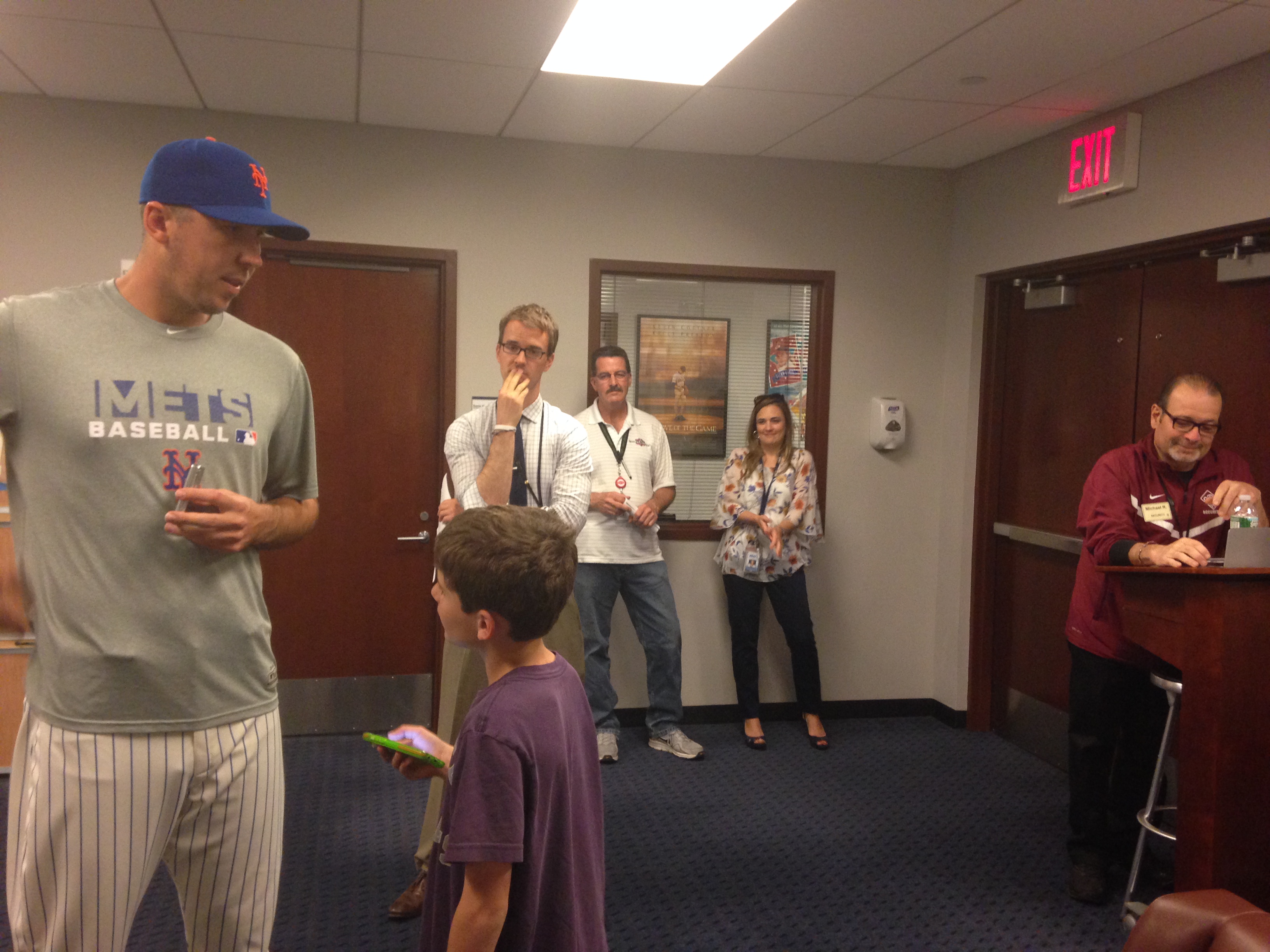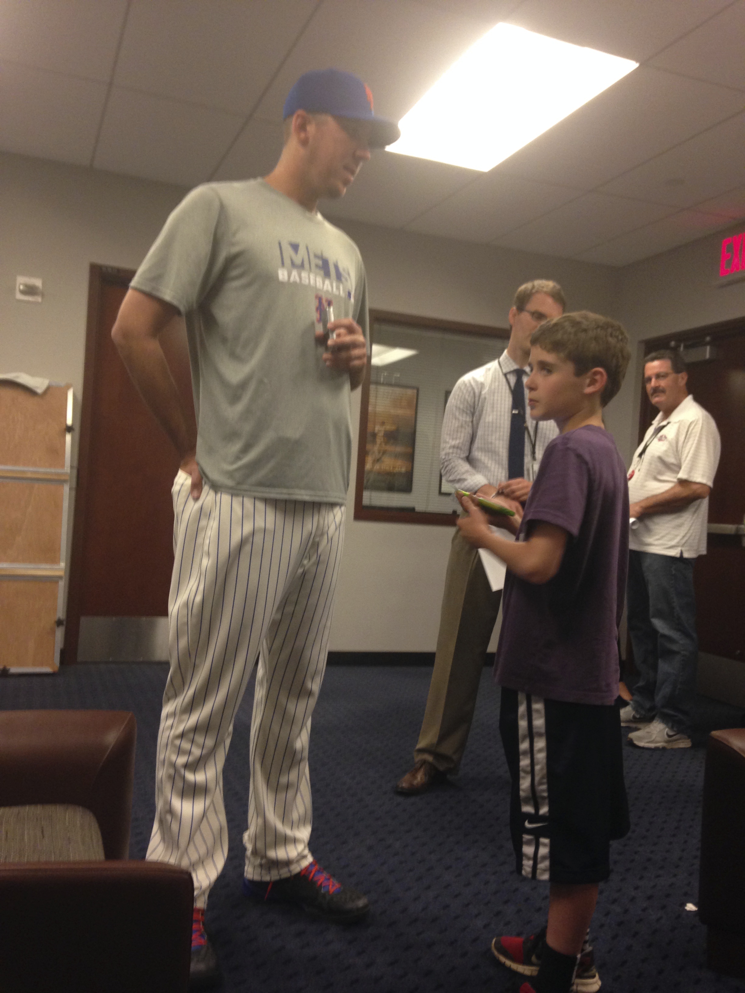 When that was over, Jonathan took us to the pressroom and quickly got the Mets play-by-play announcer, Josh Lewin, in for a quick interview. Jack nailed this one too. Then Jonathan told us that when Sandy Collins (Mets manager) came in for his press conference in 45 minutes, we could sit in the back row.