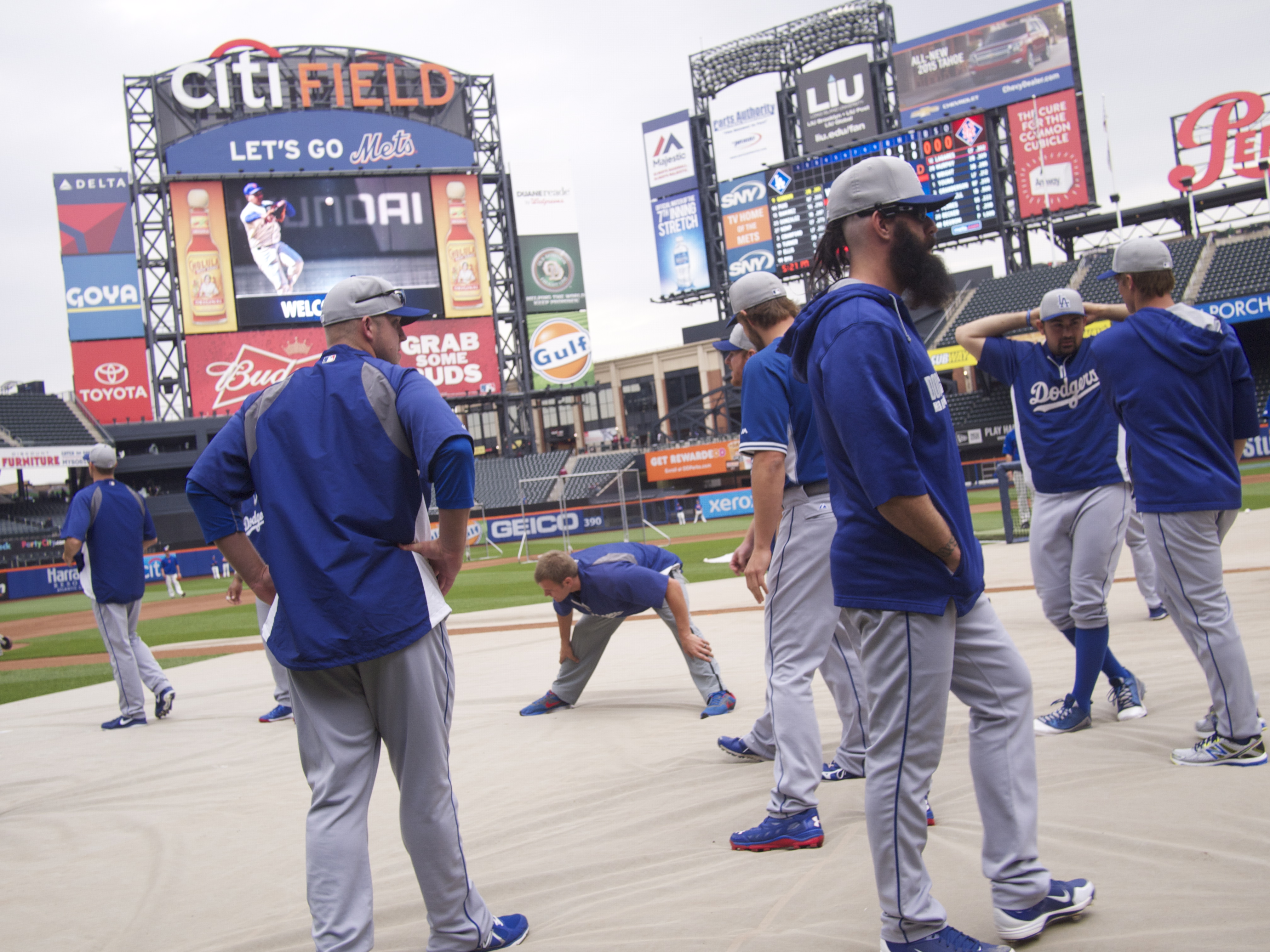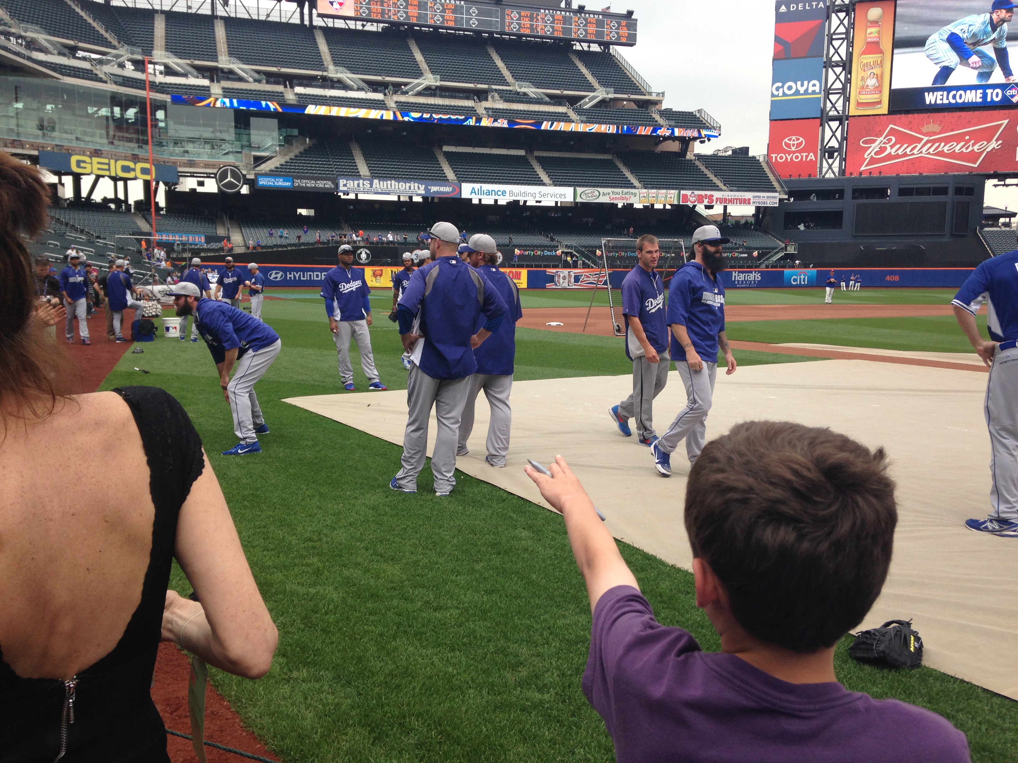“Dodgers starting to stretch.” [Dad note: guy with the beard is Brian Wilson. Him and Bobby Abreu were the only players to ignore the kids. Creepy Autograph Lady said they were both hard to get to sign.]