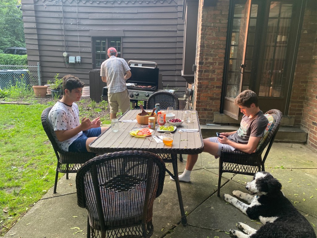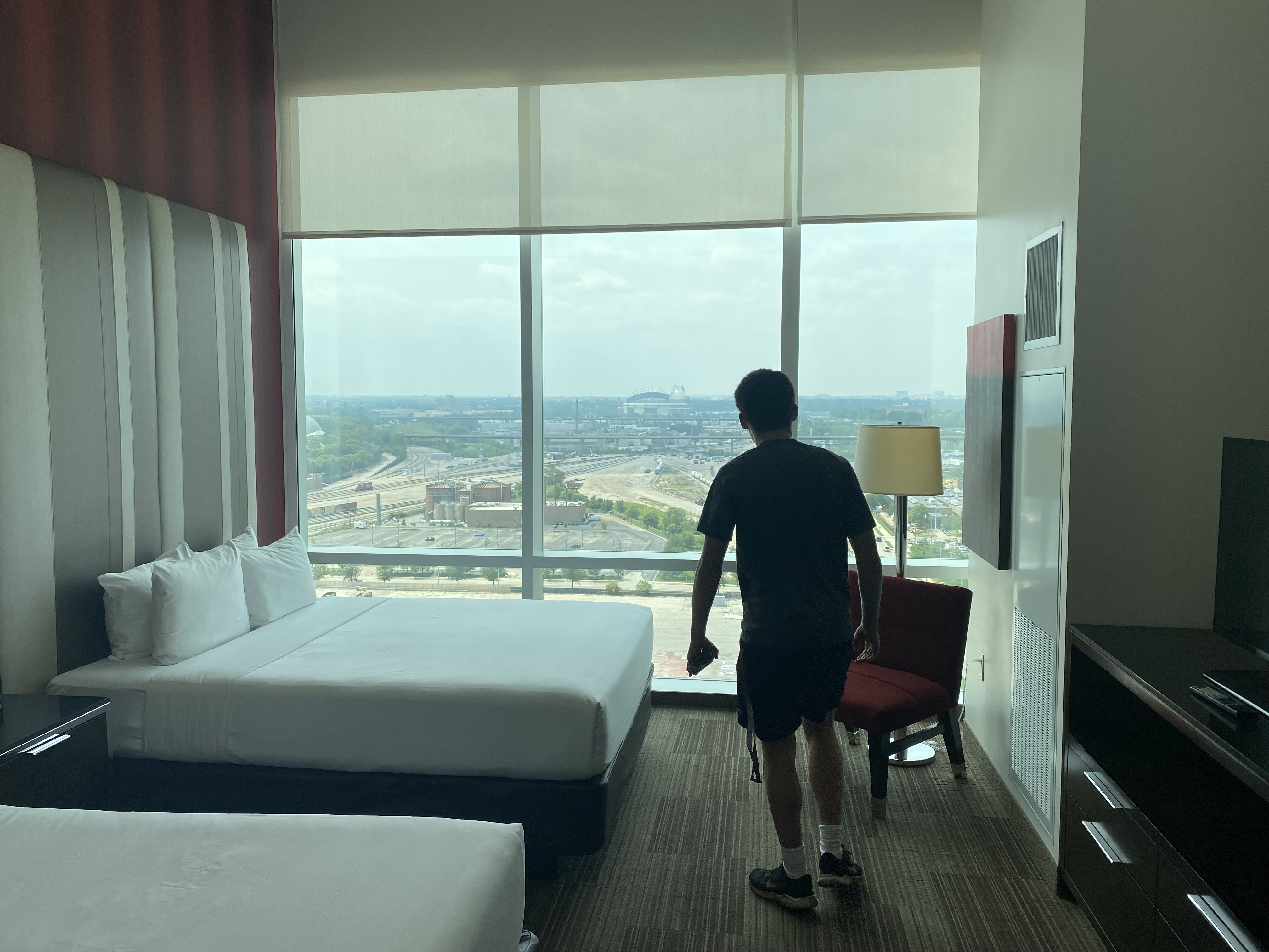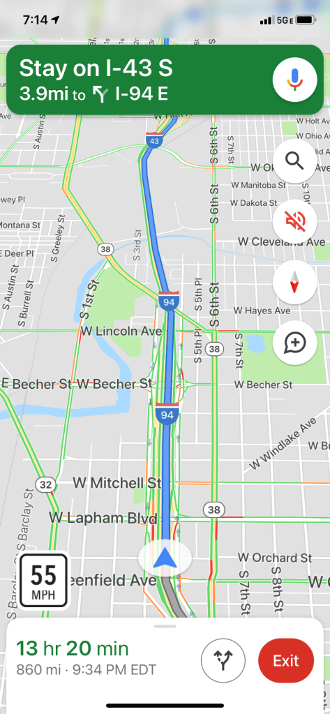 …which doesn’t do it justice, but we sat and were tired and hot and kinda hitting a wall until the baseball gods sent a breeze that brought a cold front that brought a 15 degree drop in temperature, and I brought back two bratwurst, a Pepsi for Jack, and a Leinenkugel for me (not my usual style, but Good Lord delicious), which brought us back into the state of pure gratitude that only comes from riding the arc of a full 9-inning journey that ended with us energized and appreciative, so we found two more scooters and rattled through Milwaukee to the “Deer District” packed with Bucks fans ready for Game 6, then finally a Lyft back to the hotel where we watched the NBA finals while Jack did 270 push-ups and when the Bucks won we could see fireworks from our 19th floor window and still, with all that, we got to bed by 11:00 to be up and on the road by 7:00, staring 13 hours and 49 minutes of driving right in the mouth, so I took the first shift and got us on the other side of Chicago, then Jack took us across Indiana and Ohio, ripping at a healthy 81 MPH while I took conference calls and literally presented creative concepts to a client from the passenger seat, but then Jack started to feel the drag so I took over only stopping to gas and piss and grab food quick and in no time were on the Schuylkill through Philly, across the Walt, and pulling into the driveway.