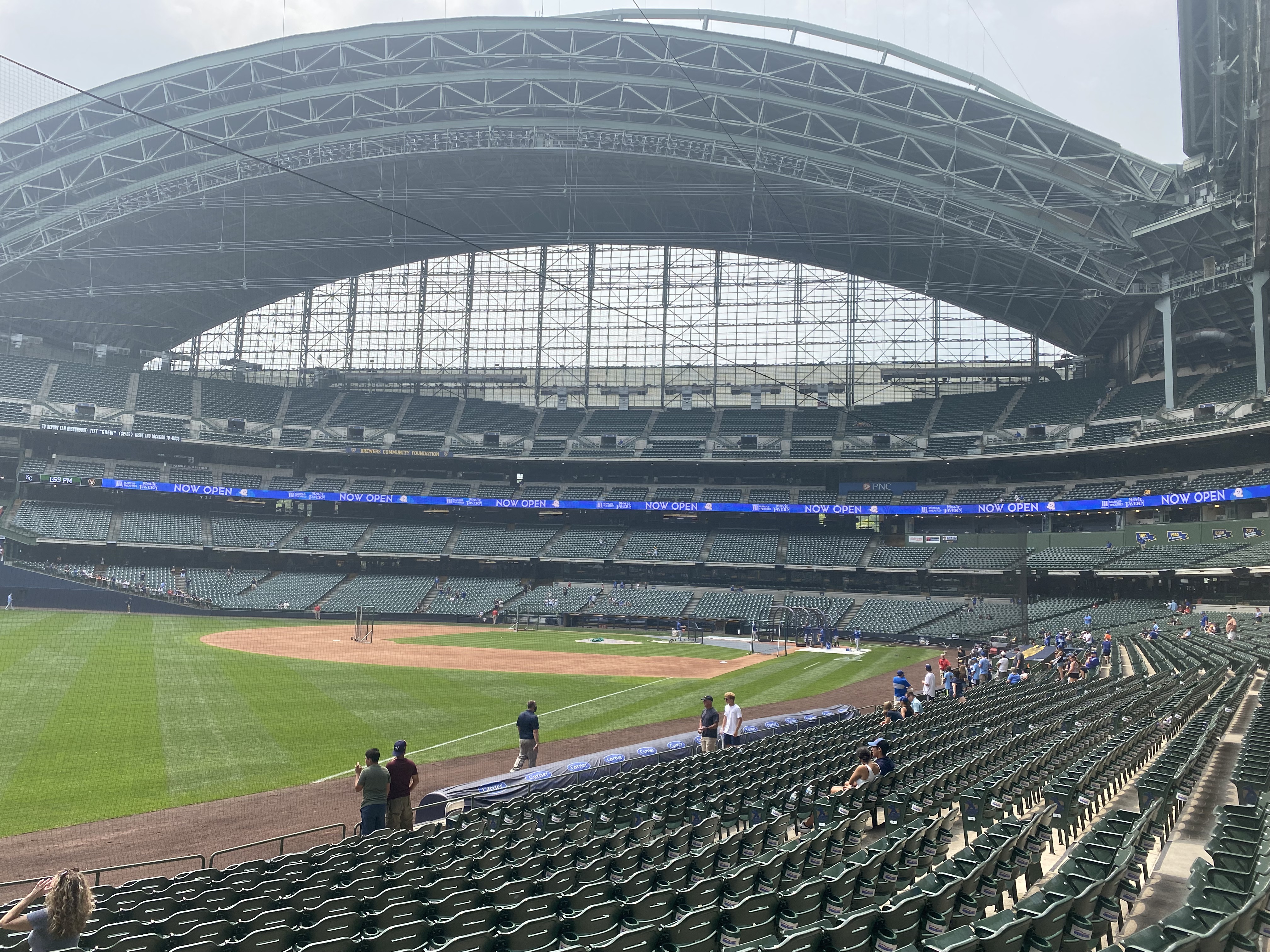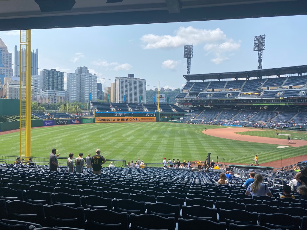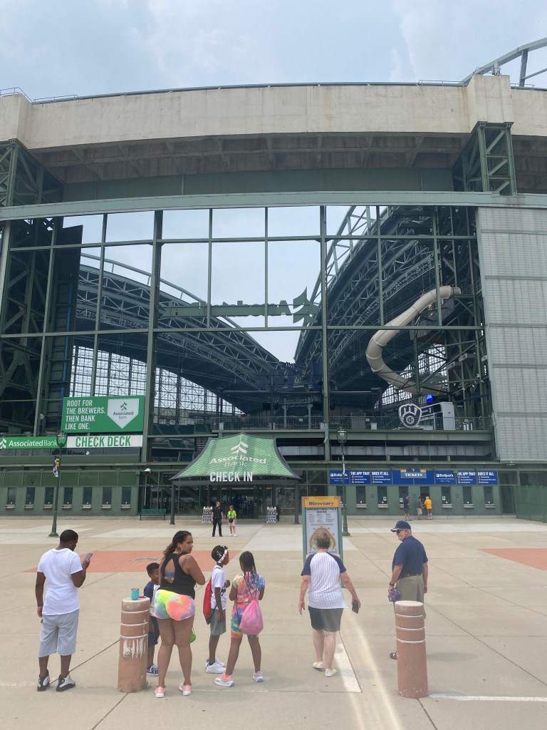 I was up at 6:00, got Jack up at 6:45, and we were on the road by 7:10 with Jack’s “Everything Mega” mix blasting out The Grateful Dead, Rolling Stones, and in what felt like minutes we’d bounded across Pennsylvania and were pulling into the lot in Pittsburgh, and then a block later we were among joyous people decked out in all manners of Pirates gear (and some Mets too), then we were through the gates and into the masterpiece of ballparks with views of yellow bridgespans and the cityscape and hillsides crowded with houses and trees where we slurped down greasy pierogis, gave the usher a $5 tip, and were soon joined by our old friends Avi and Solomon Cover to sit right at field level third base and chatter away as we watched a terrific game all the way to the last pitch then shuffling out to cars to city streets to Interstate 80 to Cover’s backyard for burgers and laughing and Avi and I split three pints and a sneak run to Jeni’s Ice Cream and somehow still in bed by 10:00, and then up again, quick shower, quick food run, and off for Chicago just flashing across the miles to our hotel nestled deep in the heart of Chinatown where we quickly threw our stuff in the room and then off and apace, striding through Chicago, so thrilled to be there, pointing out every detail of the city to each other until finally across the wide lot, wait at the gate, and then into a genuinely under-appreciated and unfairly-maligned Guaranteed Rate Field with its black steel framing and its unpretentious crowds, where we had great seats already, but for batting practice we sat in the right field section with counters and real chairs and our own waitress named Terry who let us open a tab and we never left, and I could smell grilled Chicago sausages and these four guys were chattering away behind us and my newly 18-year-old son was next to me and I was drinking a beer and I texted Shani: “I am in Nirvana”, and she texted me back to let me know that Alex said you can’t be in Nirvana, you have to achieveNirvana, so I texted back: “At the top of the 2nd inning on my son’s 18th birthday at Guaranteed Rate Field, I achieved Nirvana” and it was true, in fact, I continued to achieve Nirvana up until the final out and all the way through our walk back to the hotel and even that evening as we wandered Chinatown, went through a dingy doorway, up a shining escalator to discover a dim-sum palace for a tremendous dinner of shrimp dumplings and pork buns and mango pudding and still back and in bed by 10:00 to be up for a few work meetings and then out the door to the parking garage where Jack took it straight north in six lanes of roaring traffic and Everything Mega put on Hot for Teacher and we both air-guitared like meth addicts and soon we were at our hotel in Milwaukee, which was only 2 miles from the park, we could literally see it from our hotel window, but it was 2 miles of industrial boredom so we went to find a cab and instead the baseball gods put two electric scooters right there at the taxi stand and we were OFF, buzzing across lots and sidewalks, all the way to the gates of the marvel of engineering that is American Family Field, here, look at this photo…