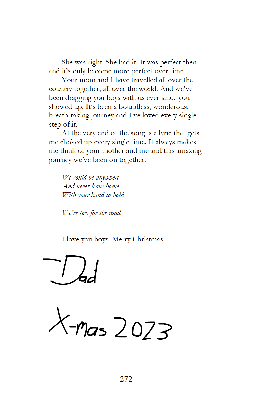 I surprised Shani and the boys with a Christmas present this year. I spent 2 years writing a book that told the story of our relationship. Then I paid to get it printed. I ended the book with the very idea I just mentioned.